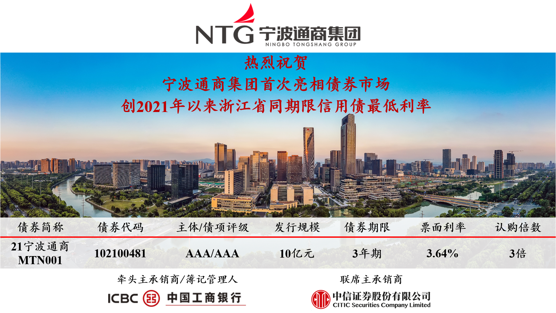 3月22日,宁波通商集团有限公司(以下简称“通商集团”)以3.64%的票面利率,成功发行了首单规模10亿元期限为3年的中期票据,创2021年以来浙江省同期限信用债最低利率。